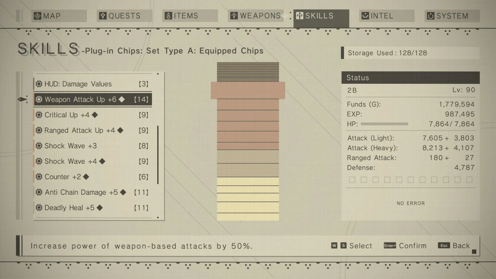 “Nier: Automata” stands out for its innovative take on character skill customization through its Chip System, a cleverly designed modular approach that fits perfectly with the game’s identity and its overarching narrative. Players can tailor their android protagonists’ abilities by equipping and combining different chips, each occupying a certain amount of memory space within the character’s system. This setup exposes constraints that is inherent with computation directly at the player’s identity. In Nier, who you are is what you can computationally afford!