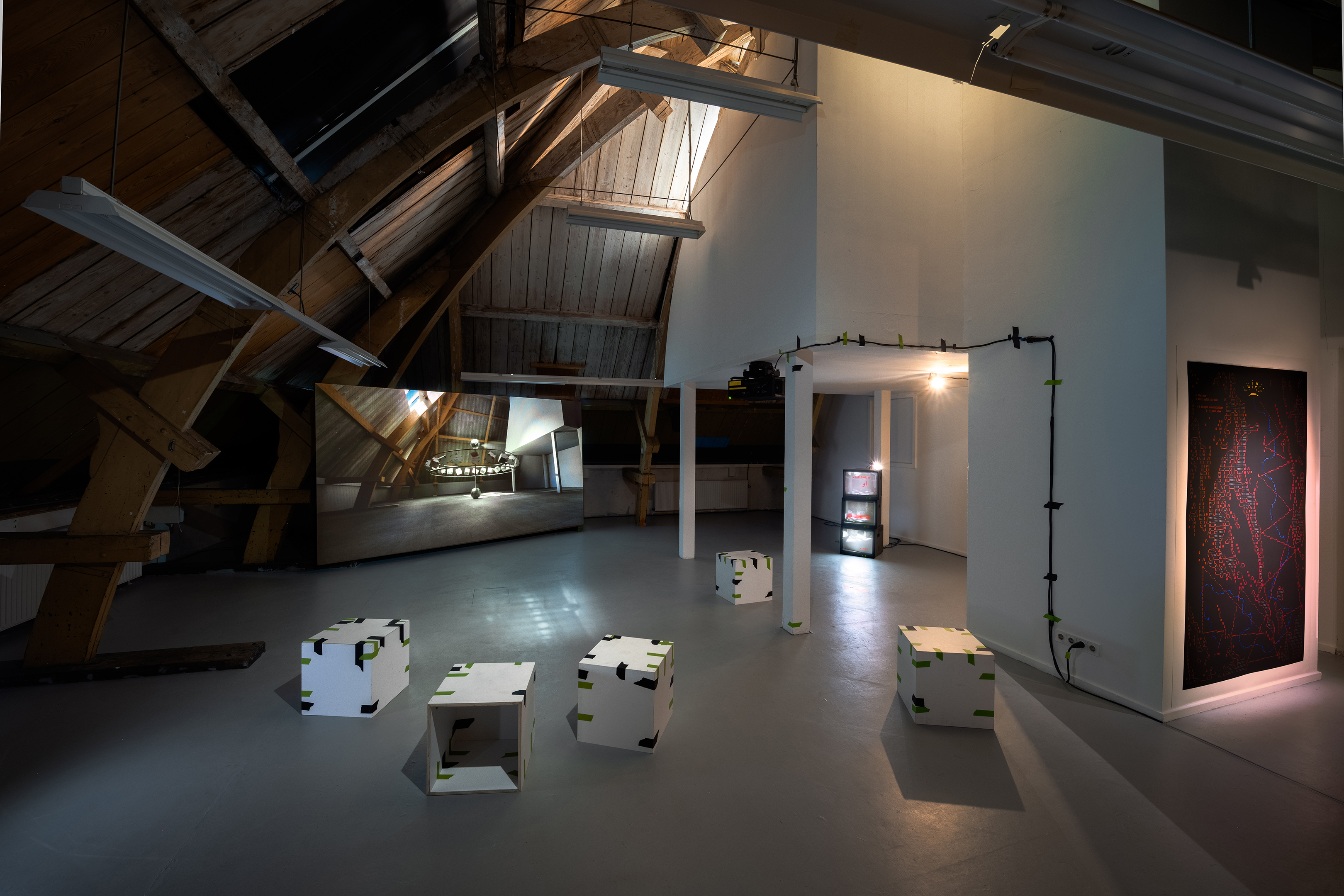 This was of course, the first attempt. a year later I moved to a bigger studio at the Rijksakademie, an attic with a very very strong presense. First thing I did after moving in was to do the same thing, only to realize after a year of working there, this space and its modular representation became a part of my film.