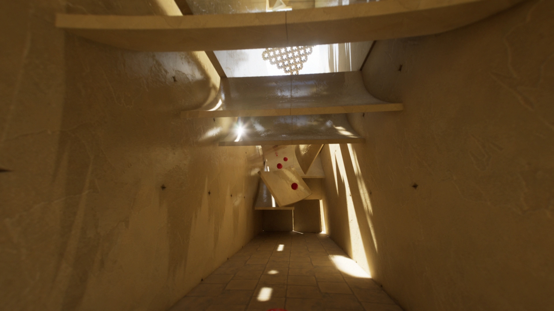 In this work, the player or the user is a red ball crawling restlessly along the route of the labyrinth. this route takes roughly 20 minutes to complete without human intervention. However, by engaging with the trackball, participants can actively navigate the spatio-temporal pathways both forward and backward, taking control of their experience.