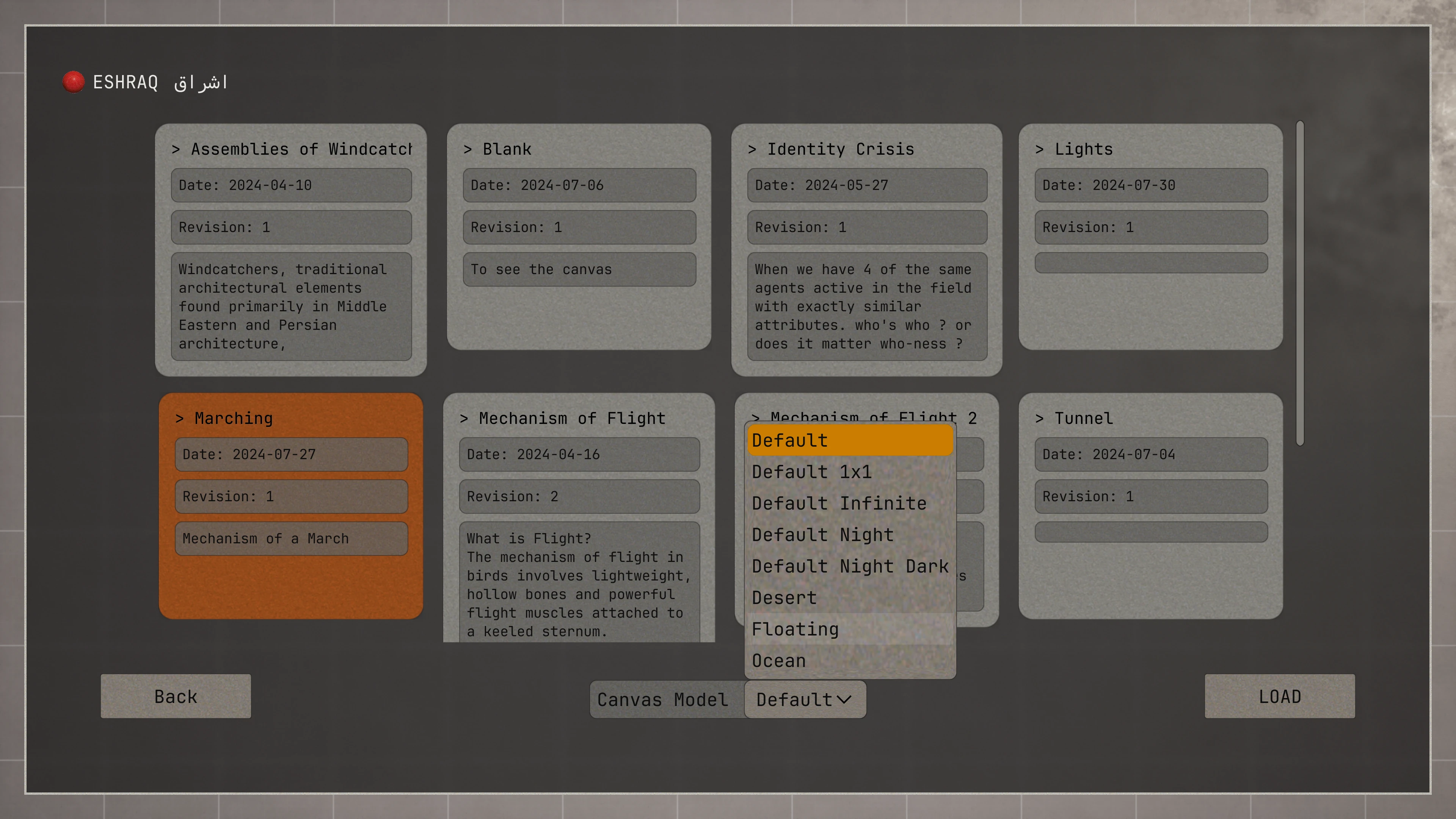 The design of Canvases isn’t bound by rules—they can be anything from a metro station to a flat grid. For now, I’ve created a few standard grid-style Canvases, minimal and distraction-free, acting as a reference for scaling models within them. Below is the list of current Canvases made in Eshraq: