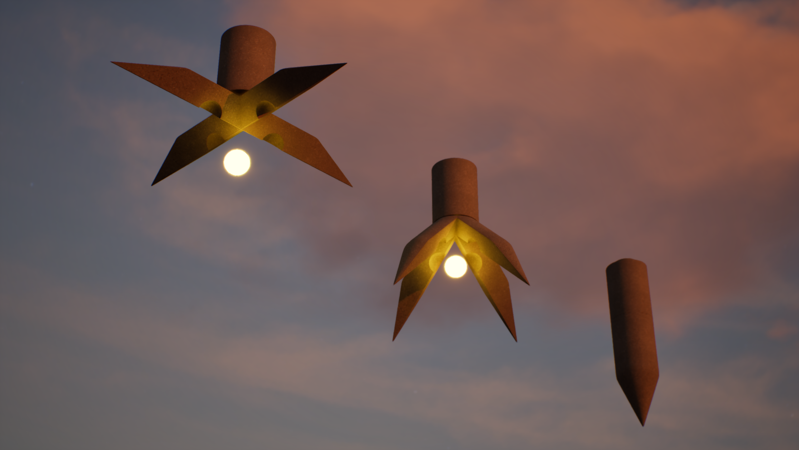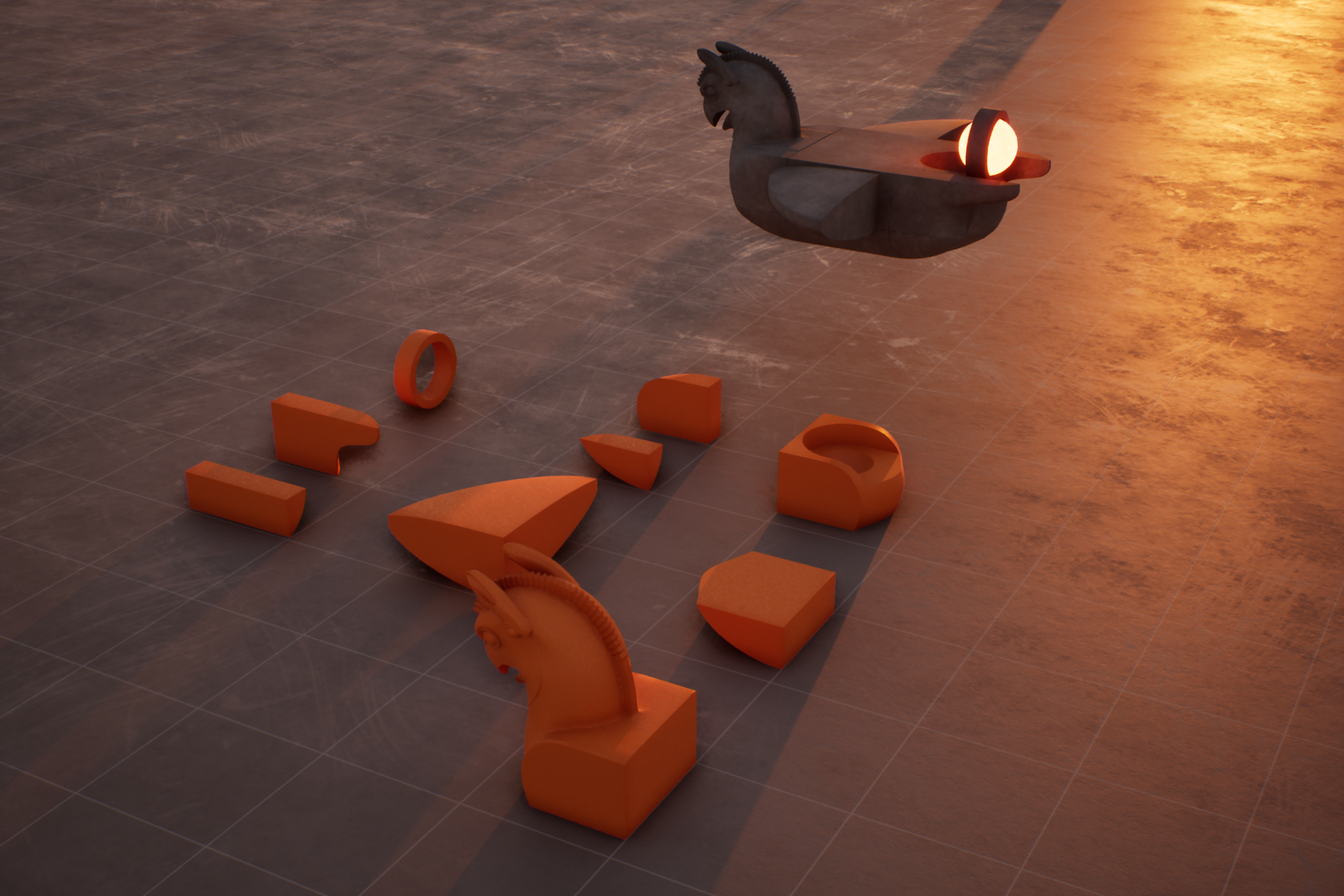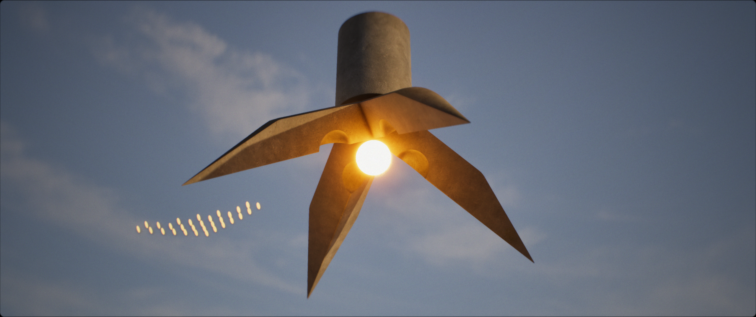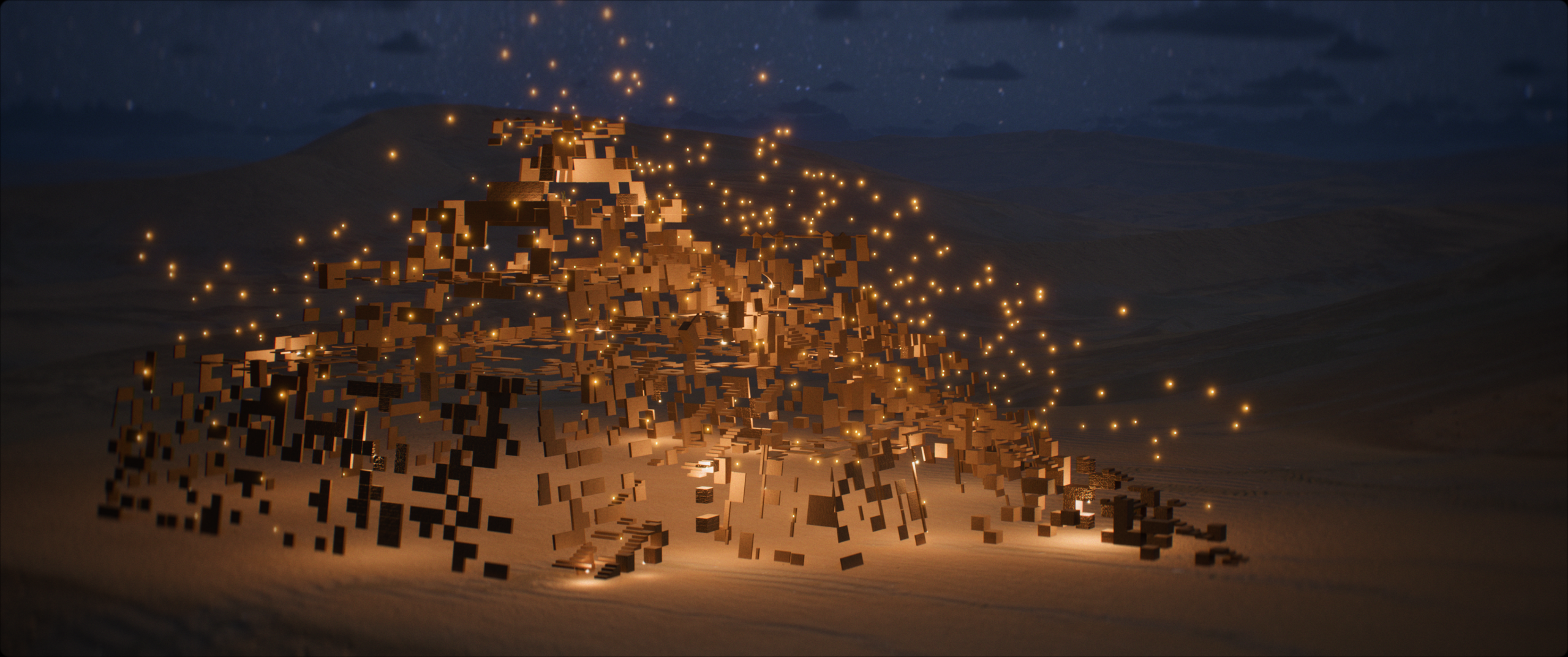 The birds pass through a very bright rectangular window of light and enter the desert. They drop rocket-like bombs that open mid-air before touching the ground. Each bomb releases an orb of light, which falls, densifies, and gradually turns into an architectural module such as a wall, stair, or floor. The empty shell then returns to the sky.
