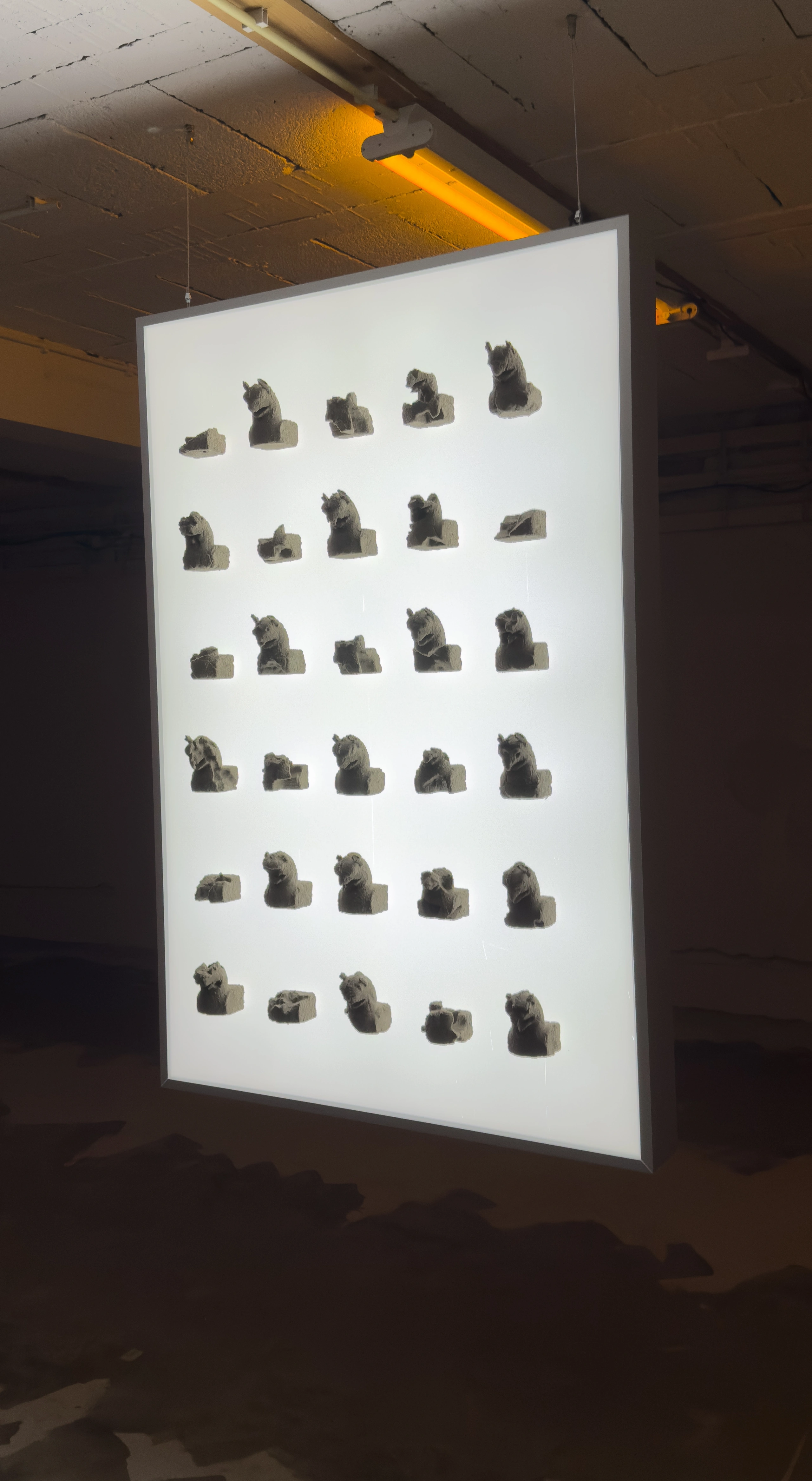 For Emerging Exits, I introduced a physical element sourced from ESHRAQ. I created a lightbox containing the thirty Huma heads, aligned as if passing through the threshold of light again, but without wings.