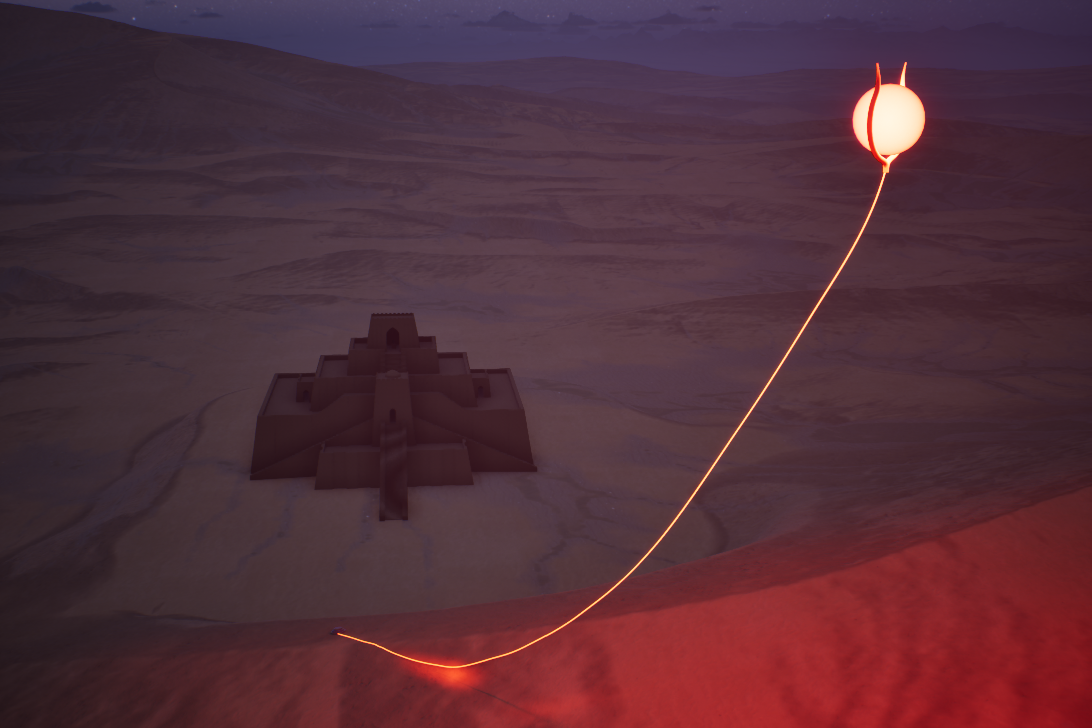 I spent a long time thinking about the design of souls in ESHRAQ and how they could be materialized. I eventually arrived at the idea of representing them as luminous red-orange spheres, almost like miniature stars hovering above specific sites.