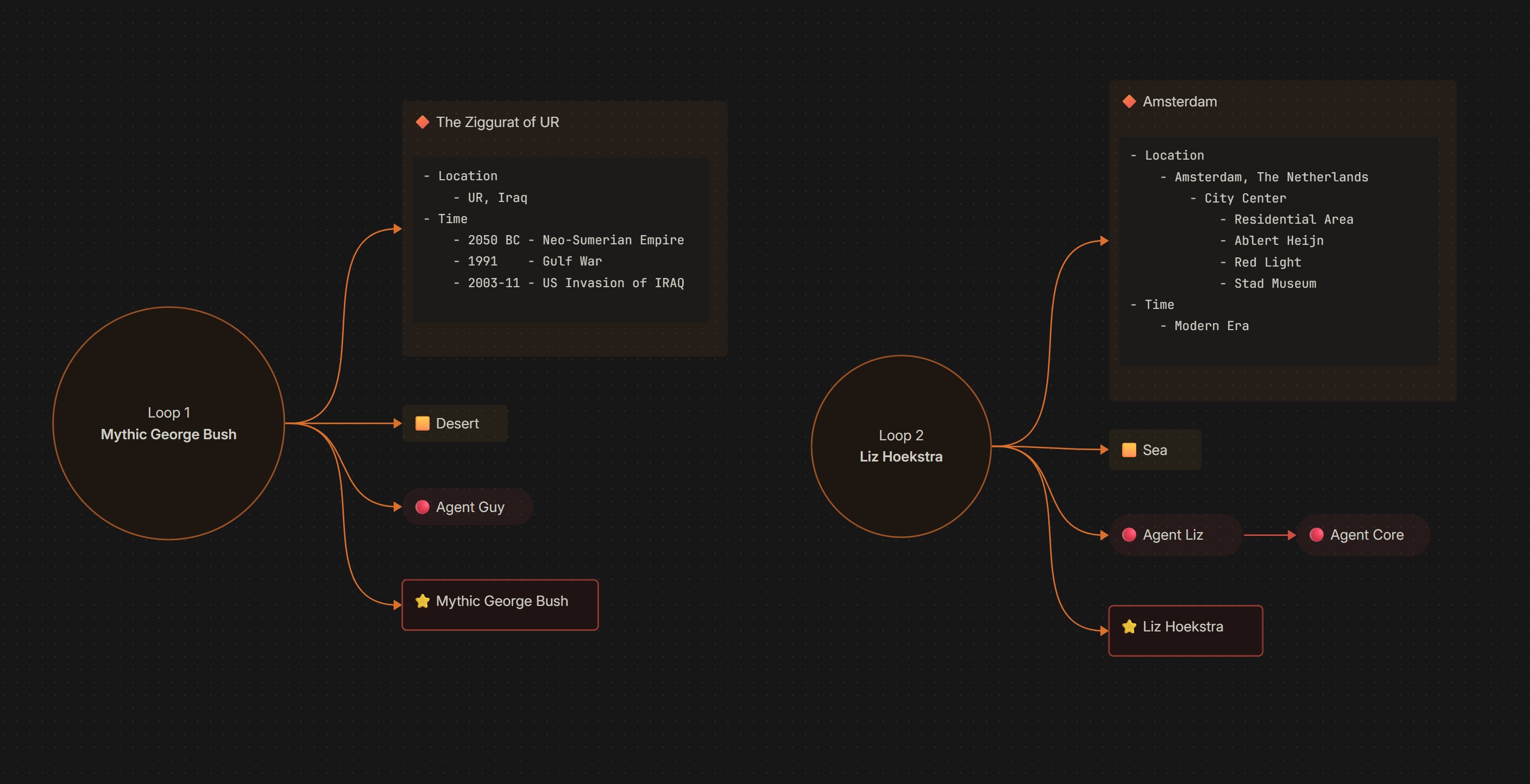 Within the film, the Ziggurat becomes a deep object where the first story loop unfolds. The soul of Mythic George Bush is spawned into the site.